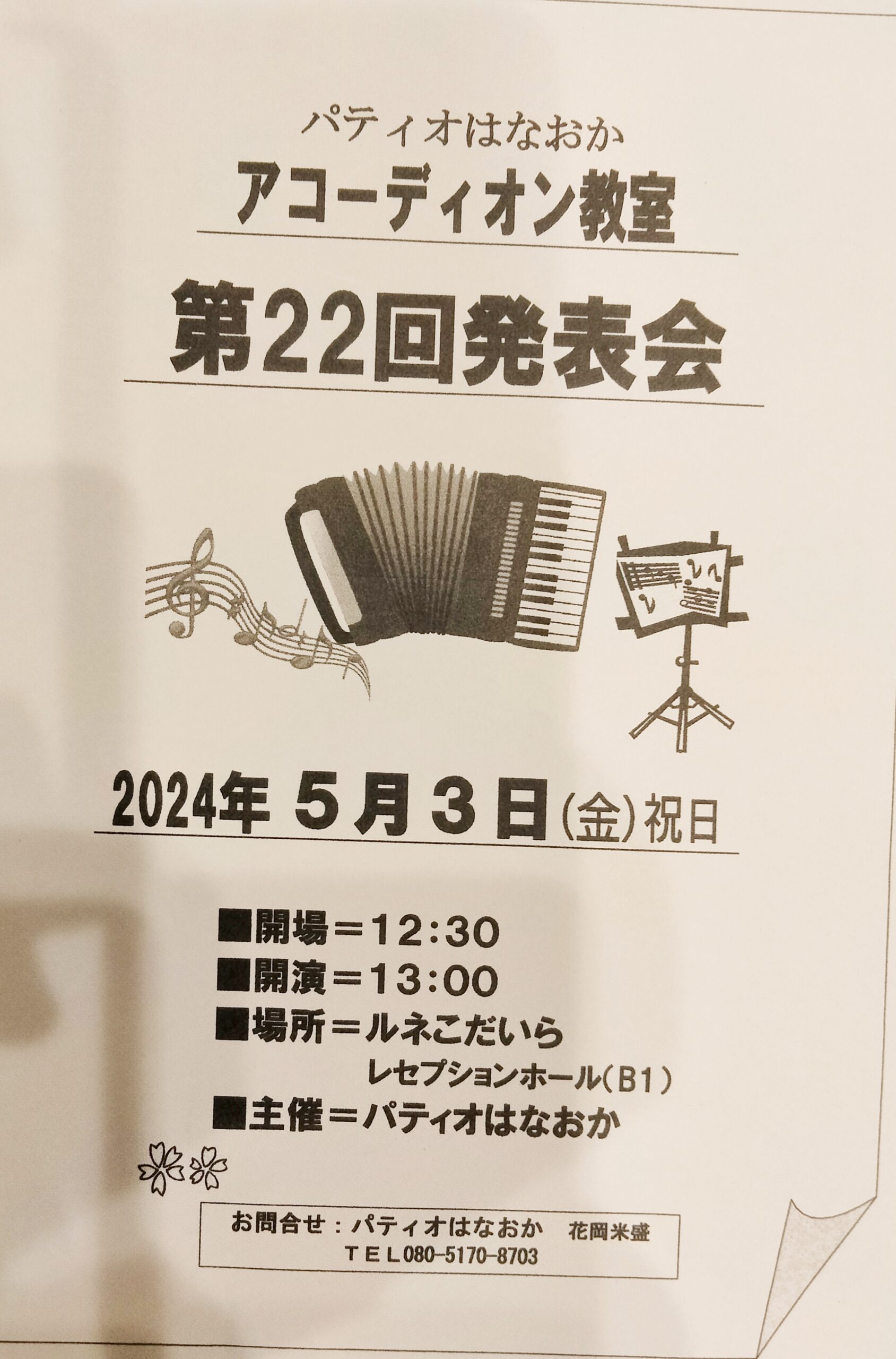 未分類 「第22回発表会」のご案内 2024.04.01 アコーディオン教室 第22回発表会 今年も下記のように発表会を行います。 連休の中日ですが是非皆さんお越しください。 入場無料 日 時: 2024年5月3日(金) 午後13時00分~ (開場12:30) 場 所: ルネこだいら B1 レセプションホール TEL.042-345-5111 小平駅南口より徒歩3分 会場には駐車場はございません。公共の交通機関をご利用ください。 Tweet Share この記事のタイトルとURLをコピーする 第12回アコーディオン伴奏で歌う会のご案内 前の記事